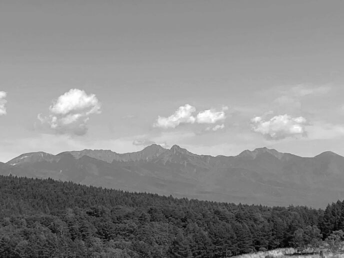 高い空、信州の山々は、草紅葉で紅く染まっている。