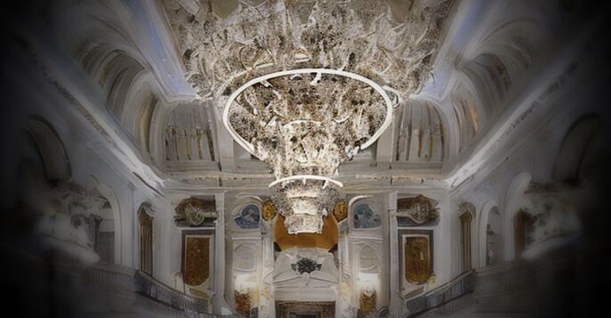 短い通路を進んだ先に、テーブルやソファの並んだ広間があった。白を基調とした内装の室内には、深い青と金の家具が並んでいる。小振りなシャンデリアから下がるクリスタルが、キラキラと水色がかったプリズムの光を反射している。どこまでが本物でどこから映像なのか分からない。右の壁に設置された暖炉のなかで炎がちらついているが、あれはきっと映像だと思う。