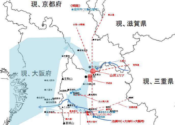 大和湖は、泊瀬(大和)河によって河内湾(大阪湾)に繋がる。