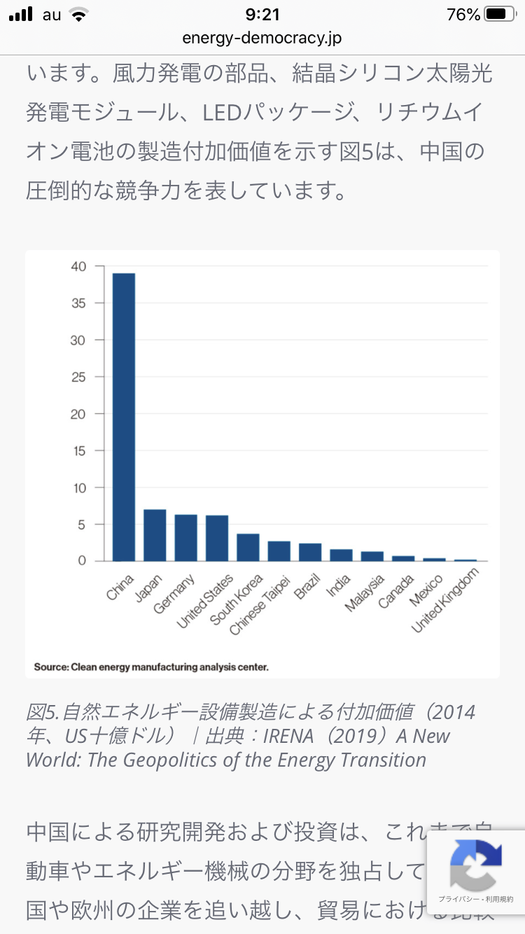 中国による研究開発および投資は、これまで自動車やエネルギー機械の分野を独占していた米国や欧州の企業を追い越し、貿易における比較優位性をもたらし、国の経済成長に貢献すると見られています(図6)。また、自然エネルギーを増やすことで、燃料輸入を減らすことができるため、中国の経済成長のボトルネックとして指摘されるエネルギーリスクを避けることもできます。