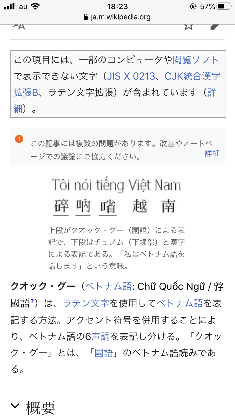 しおりを挟む上段がクオック・グー(國語)による表記で、下段はチュノム(下線部)と漢字による表記である。「私はベトナム語を話します」という意味。