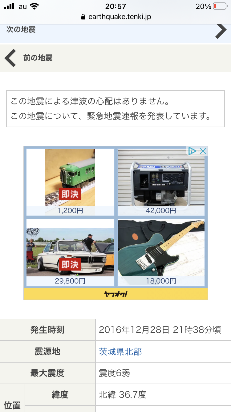 地震の情報を見ていたら、ヤフオクの広告が現れた。
