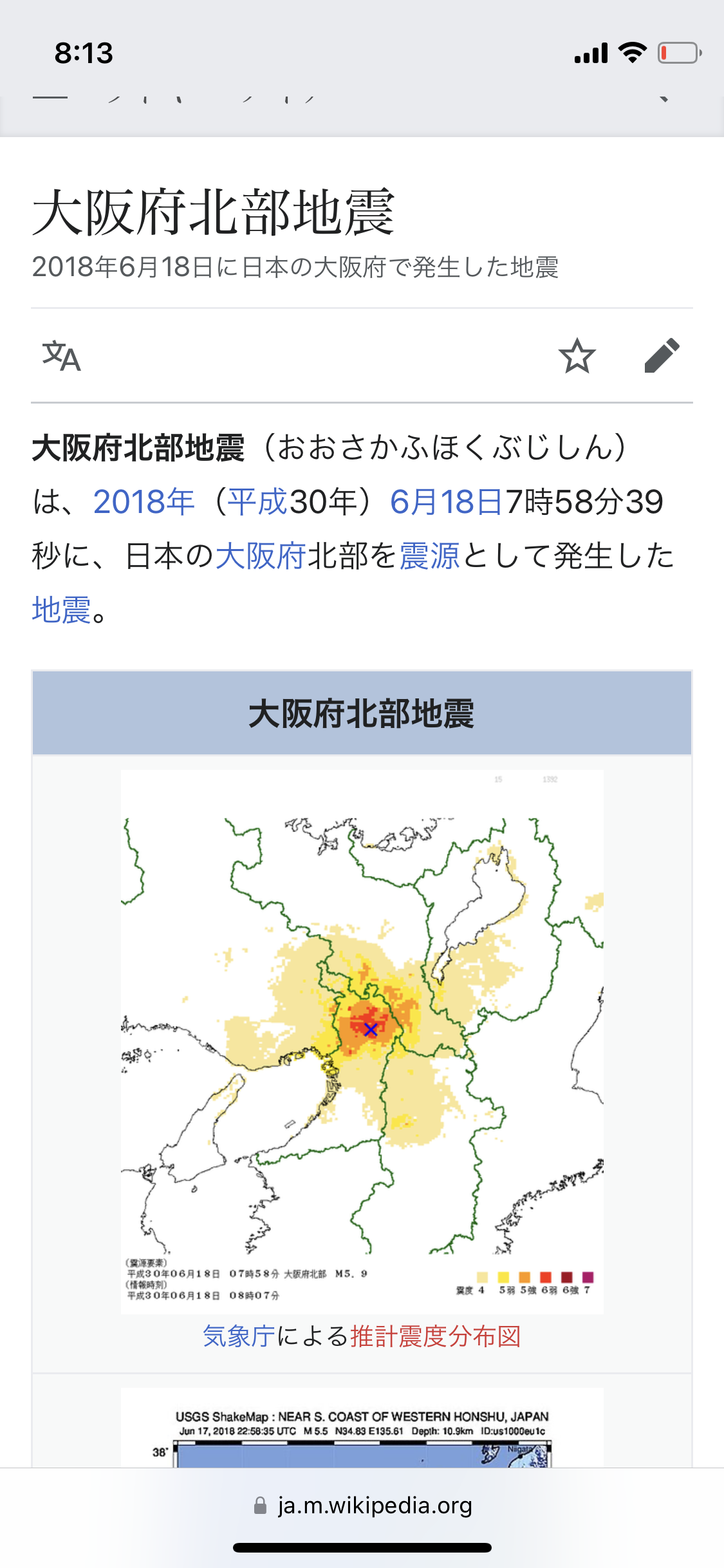 2019年8月20日までの総務省消防庁の集計によると、大阪府内で死者6人、2府5県で負傷者462人(うち重傷者62人)、住家の全壊21棟・半壊483棟・一部破損6万1266棟・床上浸水3棟・床下浸水3棟、火災は大阪府と兵庫県で7件確認されている。死者は高槻市および茨木市、大阪市、箕面市で発生している[26]。このうち箕面市の1名は、地震で持病が悪化して地震当日に亡くなったもので、災害関連死に認定されている[27]。