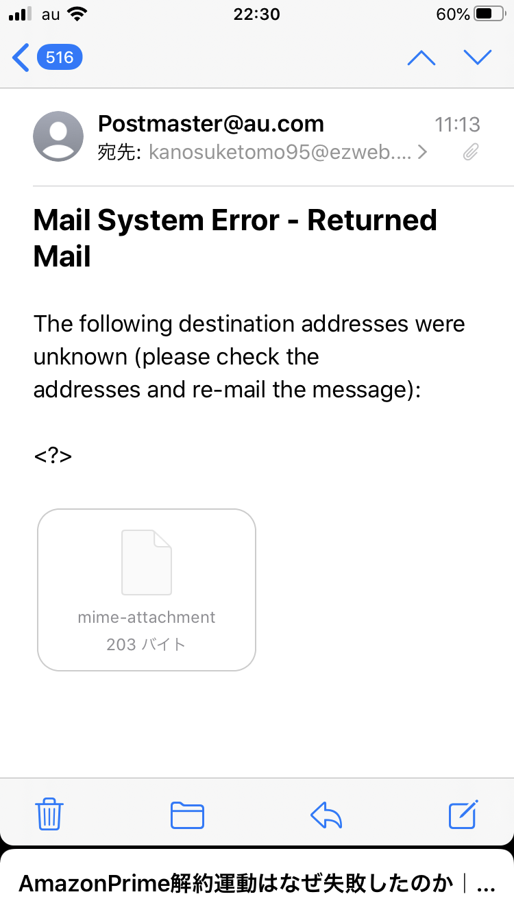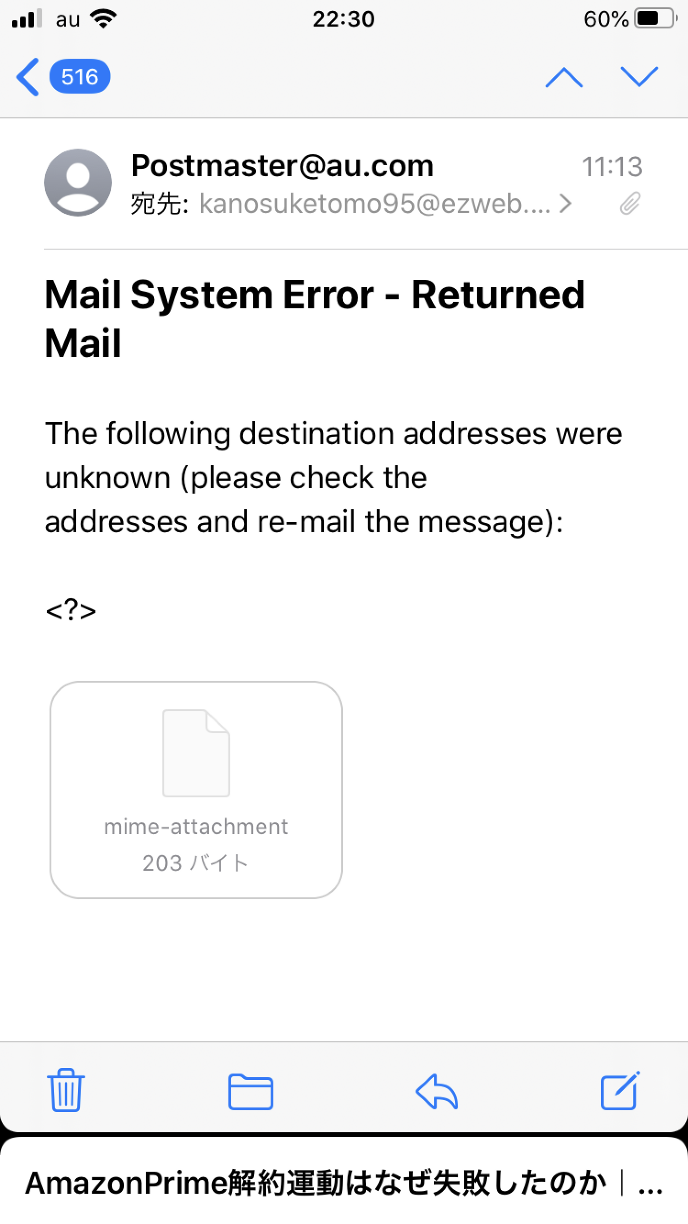 しおりを挟む宛先を間違えて入力したら、こんなメールが来る。