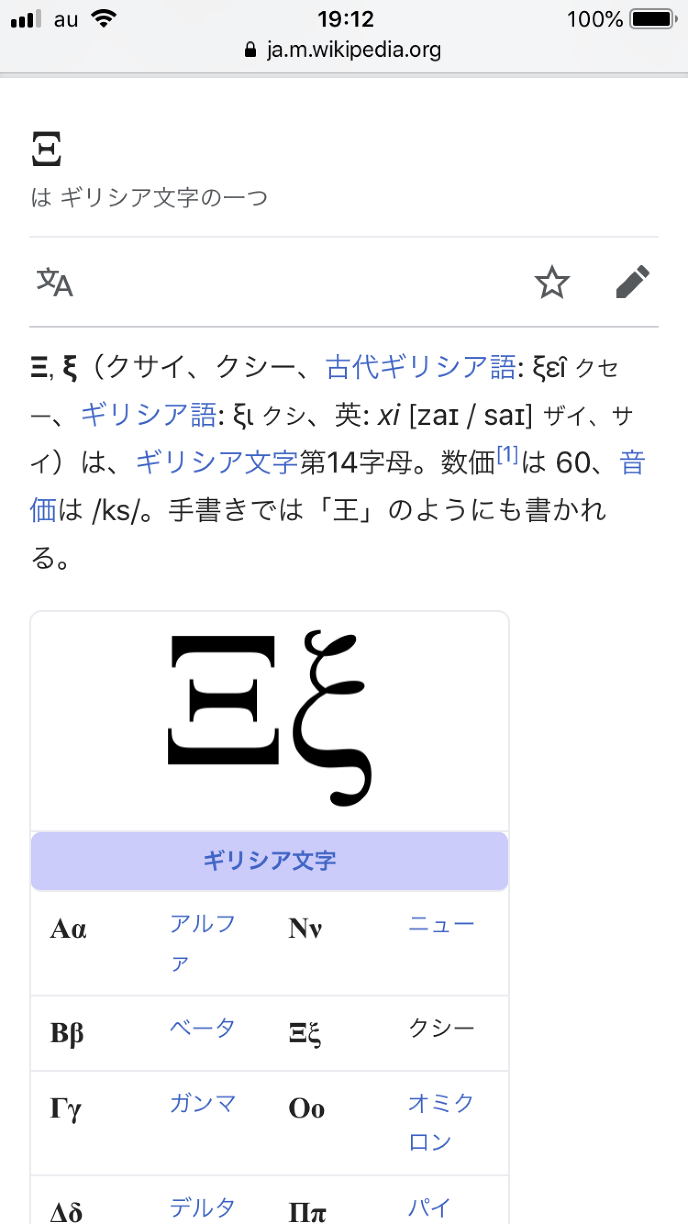 Ξ, ξ(クサイ、クシー、古代ギリシア語: ξεῖ クセー、ギリシア語: ξι クシ、英: xi [zaɪ / saɪ] ザイ、サイ)は、ギリシア文字第14字母。数価[1]は 60、音価は /ks/。手書きでは「王」のようにも書かれる。
