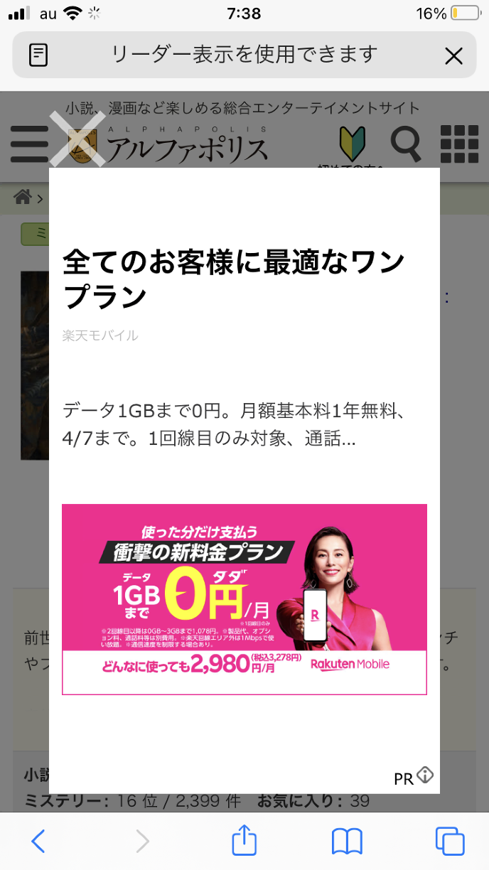 × を押して、広告を消さなきゃ、アルファポリスに入れない。