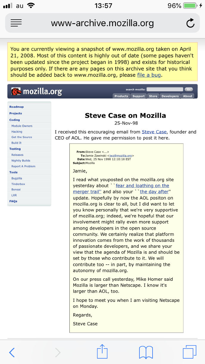 しおりを挟むオープンなコミュニティを形成することにより、Mozilla プロジェクトは ひとつの企業よりも巨大な組織 に成長しました。 コミュニティメンバーが参加することにより、プロジェクトの当初の ミッション の視野が広がり、人々は Netscape の次のブラウザーを開発するだけでなく、様々なブラウザー や 開発ツール、他の領域の プロジェクト まで作り上げました。 人々は様々な面から Mozilla に貢献しましたが、すべての人々が、インターネットにおける選択肢を提供するフリーソフトウェアを作ることに情熱を燃やしていました。