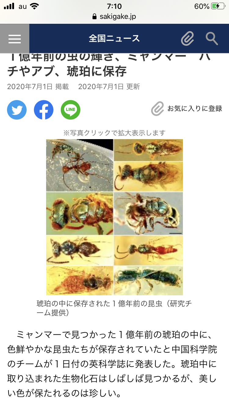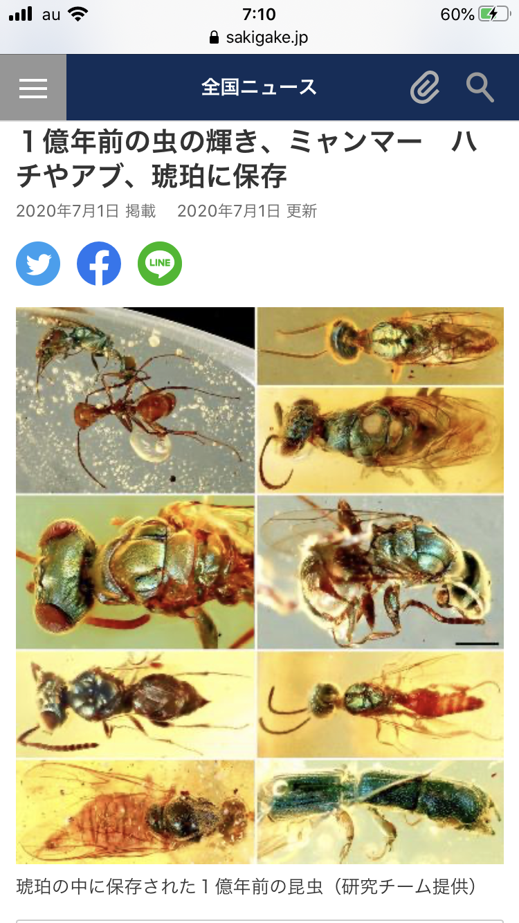 ●ミャンマーで見つかった1億年前の琥珀の中に、色鮮やかな昆虫たちが保存されていたと中国科学院のチームが1日付の英科学誌に発表した。