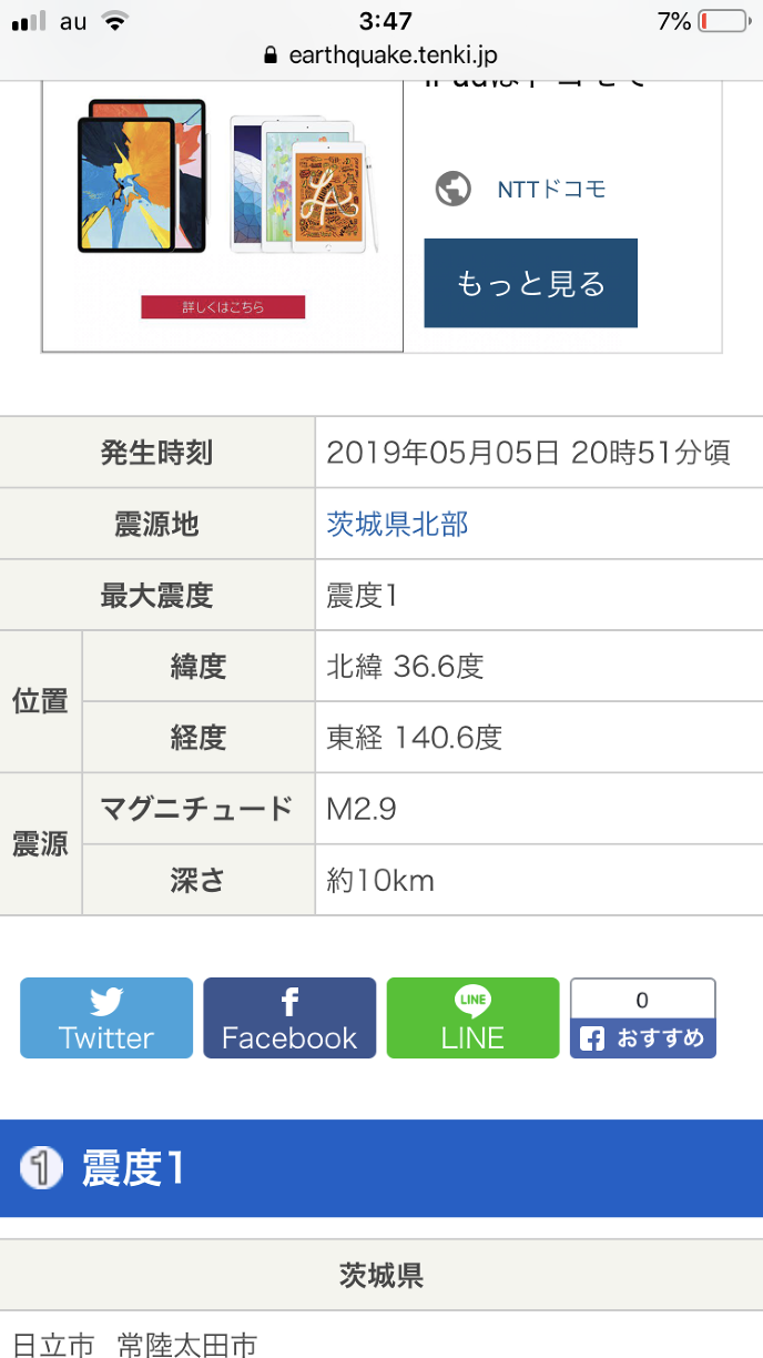最大震度 震度1