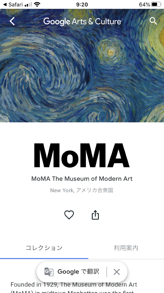 しおりを挟むFounded in 1929, The Museum of Modern Art (MoMA) in midtown Manhattan was the first museum devoted to the modern era. Today MoMA’s rich and varied collection offers a panoramic overview of modern and contemporary art, from the innovative European painting and sculpture of the 1880s to today's film, design, and performance art. From an initial gift of eight prints and one drawing, the collection has grown to include over 150,000 paintings, sculptures, drawings, prints, photographs, architectural models and drawings, and design objects; approximately 22,000 films and four million film stills; and, in its Library and Archives, over 300,000 books, artist books, and periodicals, and extensive individual files on more than 70,000 artists. Collection highlights include Claude Monet’s Water Lilies, Vincent van Gogh’s The Starry Night, and Pablo Picasso’s Les Demoiselles d'Avignon, along with more recent works by Andy Warhol, Elizabeth Murray, Cindy Sherman, and many others.