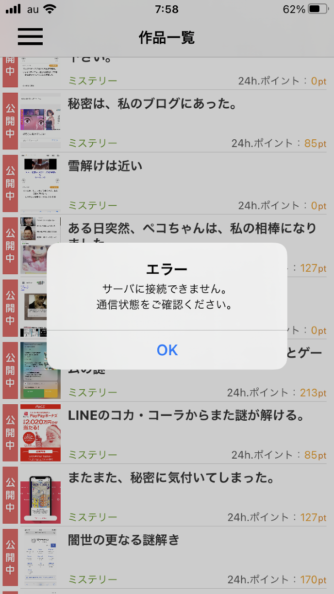 また、サーバに接続できません。通信状況をご確認くださいという表示が出た。