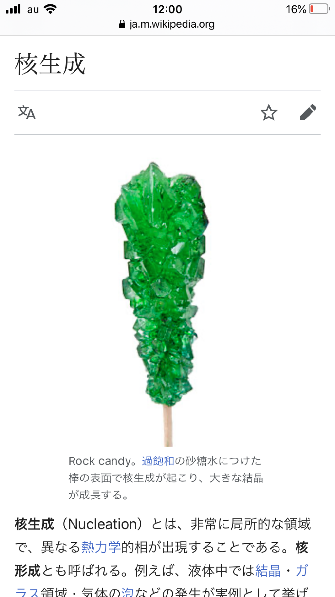 過飽和の砂糖水につけた棒の表面で核生成が起こり、大きな結晶が成長する。