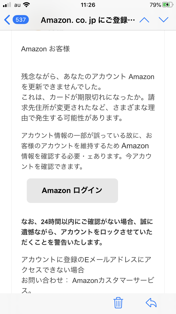 今朝9時18分、Amazonから、警告のメールが来た。