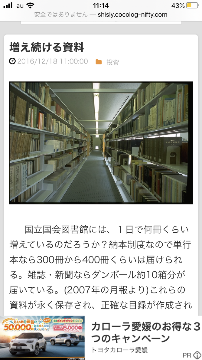 国立国会図書館には、1日で何冊くらい増えているのだろうか?納本制度なので単行本なら300冊から400冊くらいは届けられる。雑誌・新聞ならダンボール約10箱分が届いている。(2007年の月報より)これらの資料が永く保存され、正確な目録が作成されて、いつでも利用できるようにされている。しかし、おそらくすべての資料に実際に目をとおしたり、読んで記憶したりする人は誰もいない。たぶんほとんどの資料は多くの人に目もふれることなく、書庫の奥深く保管されていく。いかなる読書家・収集家であろうと、これら資料の1パーセントも人の目にふれることはないだろう。だが図書館の基本的な使命は、利用者が必要とする資料を提供することにある。そして、現在の利用者だけでなく、未来の利用者に対しても資料を提供していかなければならい。あるとき、会議で本の背ラベルに受け入れ年、西暦の2桁を入れる提案がだされたことがある。理由は廃棄のときに5年以上前の本をぬきだす作業がしやすくなるというのである。効率的、機械的なことが優先される時代であったが、私は猛反対した。資料保存が未来の身だ見ぬ人のためであることを忘れてはならない。