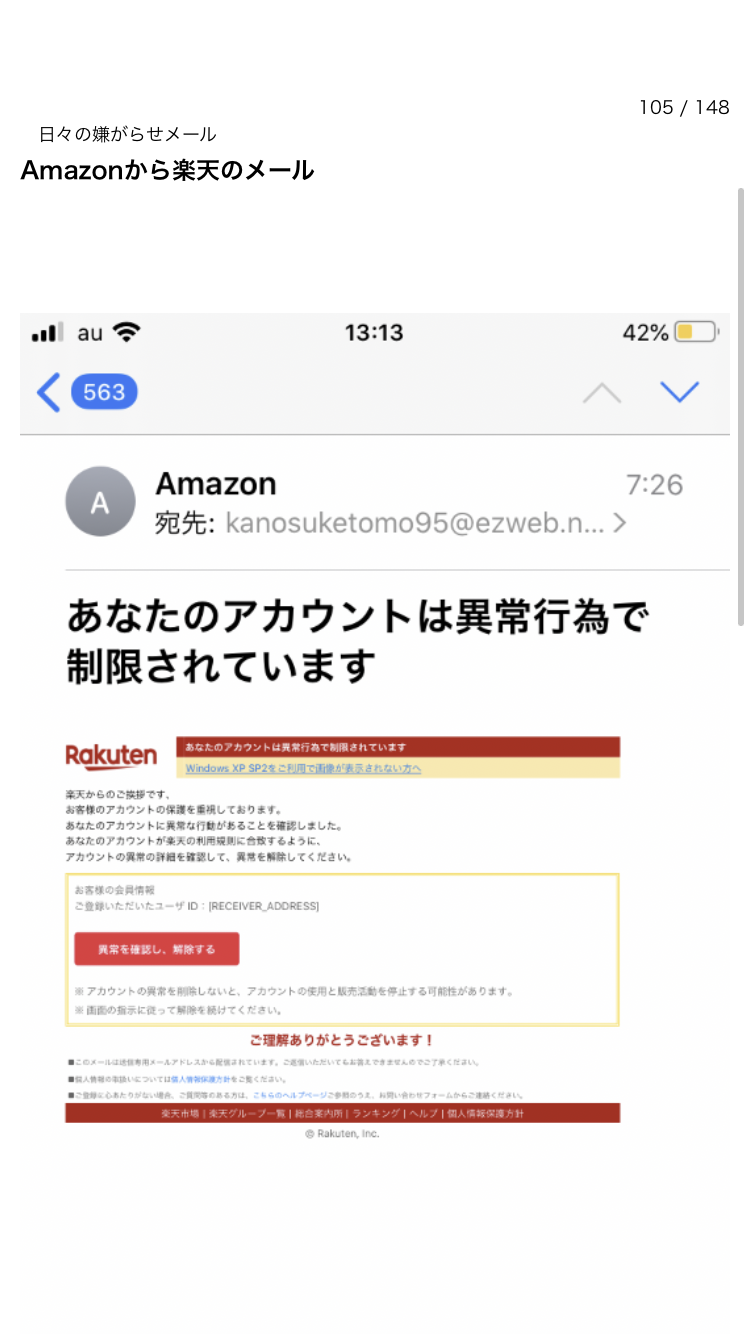 楽天のアカウントが制限されていますという内容だった。