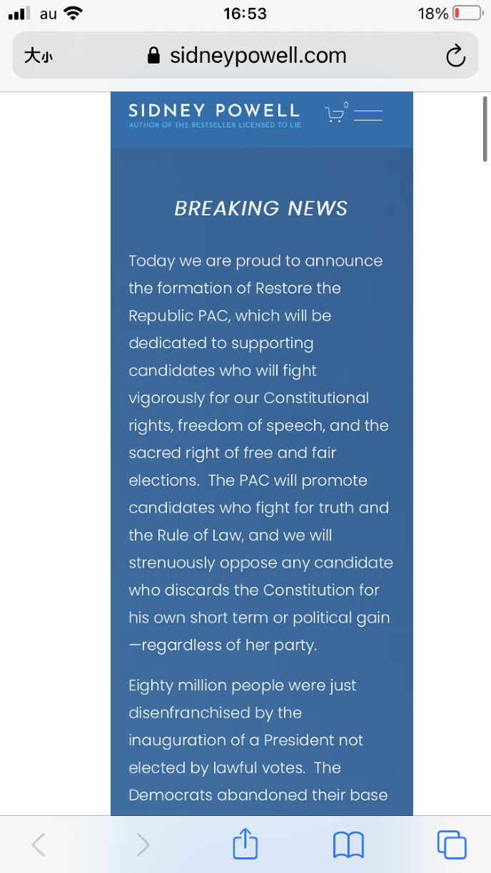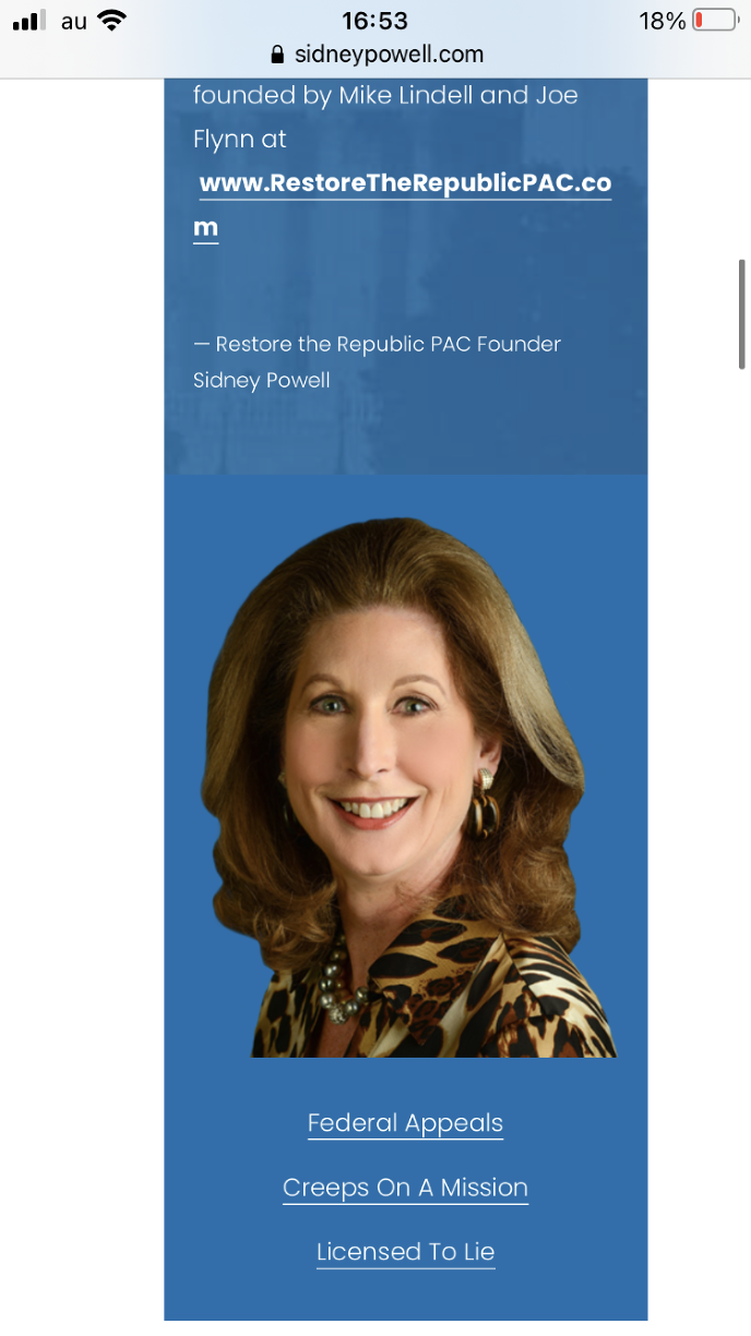 しおりを挟むシドニー・キャサリン・パウエルは、アメリカ合衆国の弁護士。2020年アメリカ合衆国大統領選挙の結果を覆そうとする試みに参加したことで最もよく知られている。 ノースカロライナ大学のロースクールを修了後、連邦検察官としてテキサス州やバージニア州に赴任。 ウィキペディア