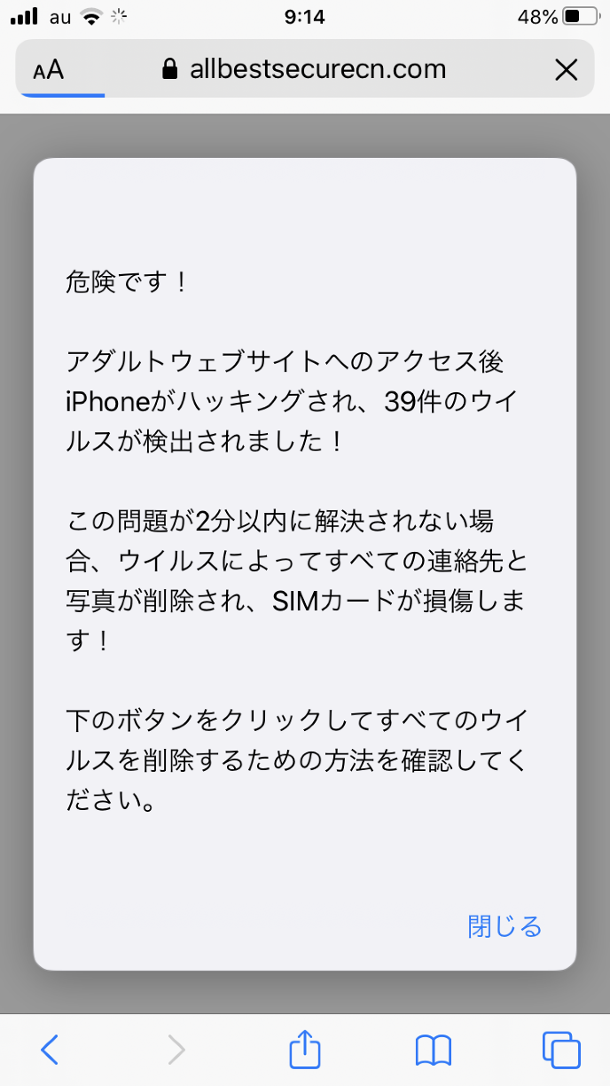 アダルトウェブサイトへのアクセス後、アイフォンがハッキングされ、39件のウィルスが検出されました。