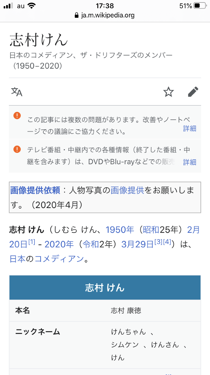 ウィキペディアで、志村けんさんの画像提供者は、まだ現れないが、こんな人の顔写真を見ることが出来る。