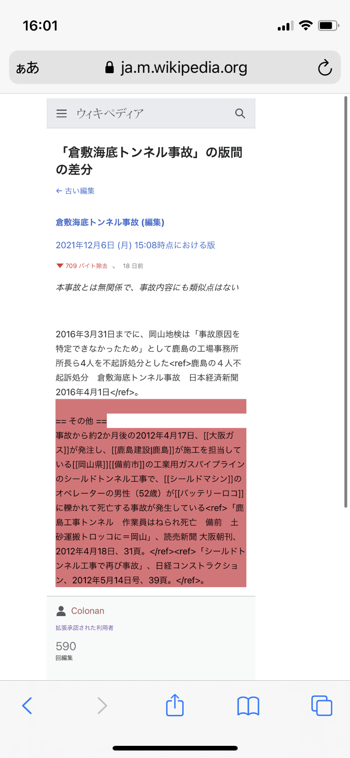 事故から約2か月後の2012年4月17日、[[大阪ガス]]が発注し、[[鹿島建設|鹿島]]が施工を担当している[[岡山県]][[備前市]]の工業用ガスパイプラインのシールドトンネル工事で、[[シールドマシン]]のオペレーターの男性(52歳)が[[バッテリーロコ]]に轢かれて死亡する事故が発生している<ref>「鹿島工事トンネル 作業員はねられ死亡 備前 土砂運搬トロッコに=岡山」、読売新聞 大阪朝刊、2012年4月18日、31頁。</ref><ref>「シールドトンネル工事で再び事故」、日経コンストラクション、2012年5月14日号、39頁。</ref>。