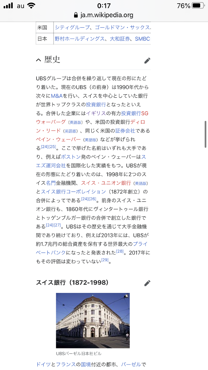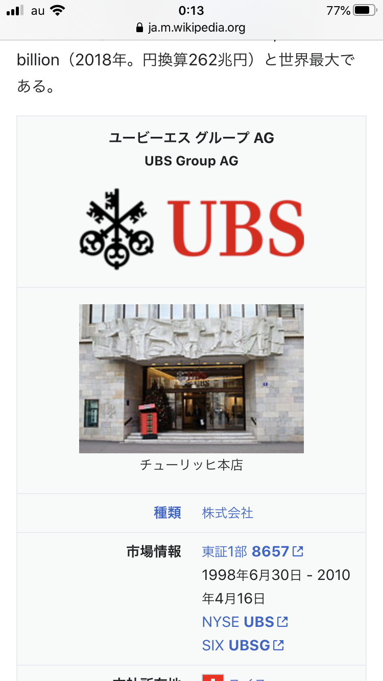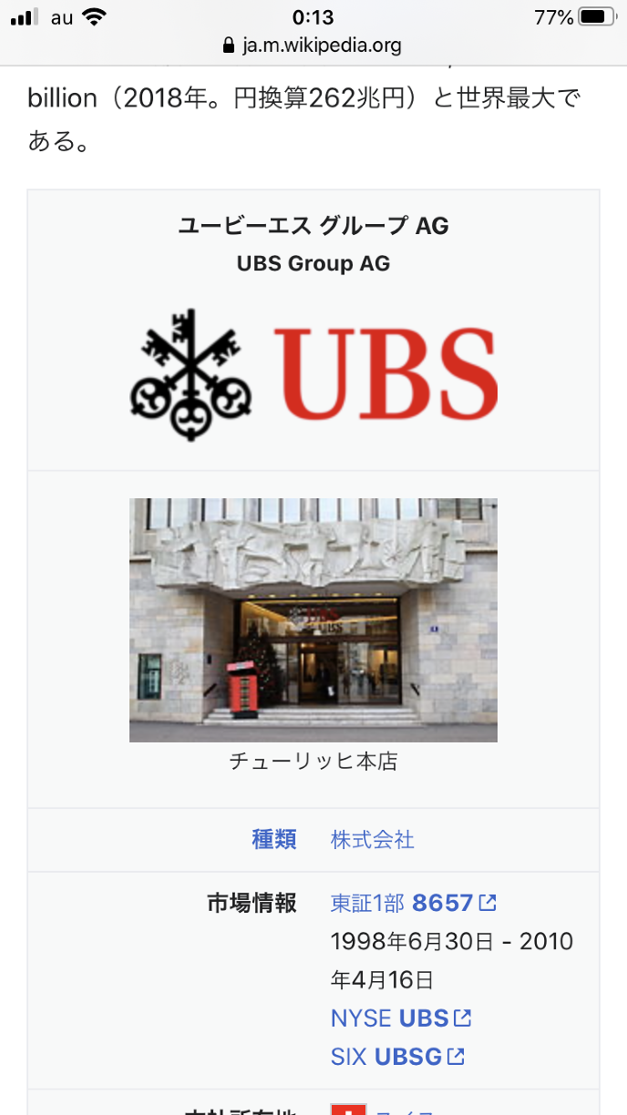 ユービーエス AG(UBS AG)およびユービーエス グループ AG(UBS Group AG)は、スイスのチューリヒおよびバーゼルに本拠を置くスイス最大の銀行であり、世界有数の金融持株会社。プライベートバンク部門が預かる資産はUSD2,403 billion(2018年。円換算262兆円)と世界最大である。