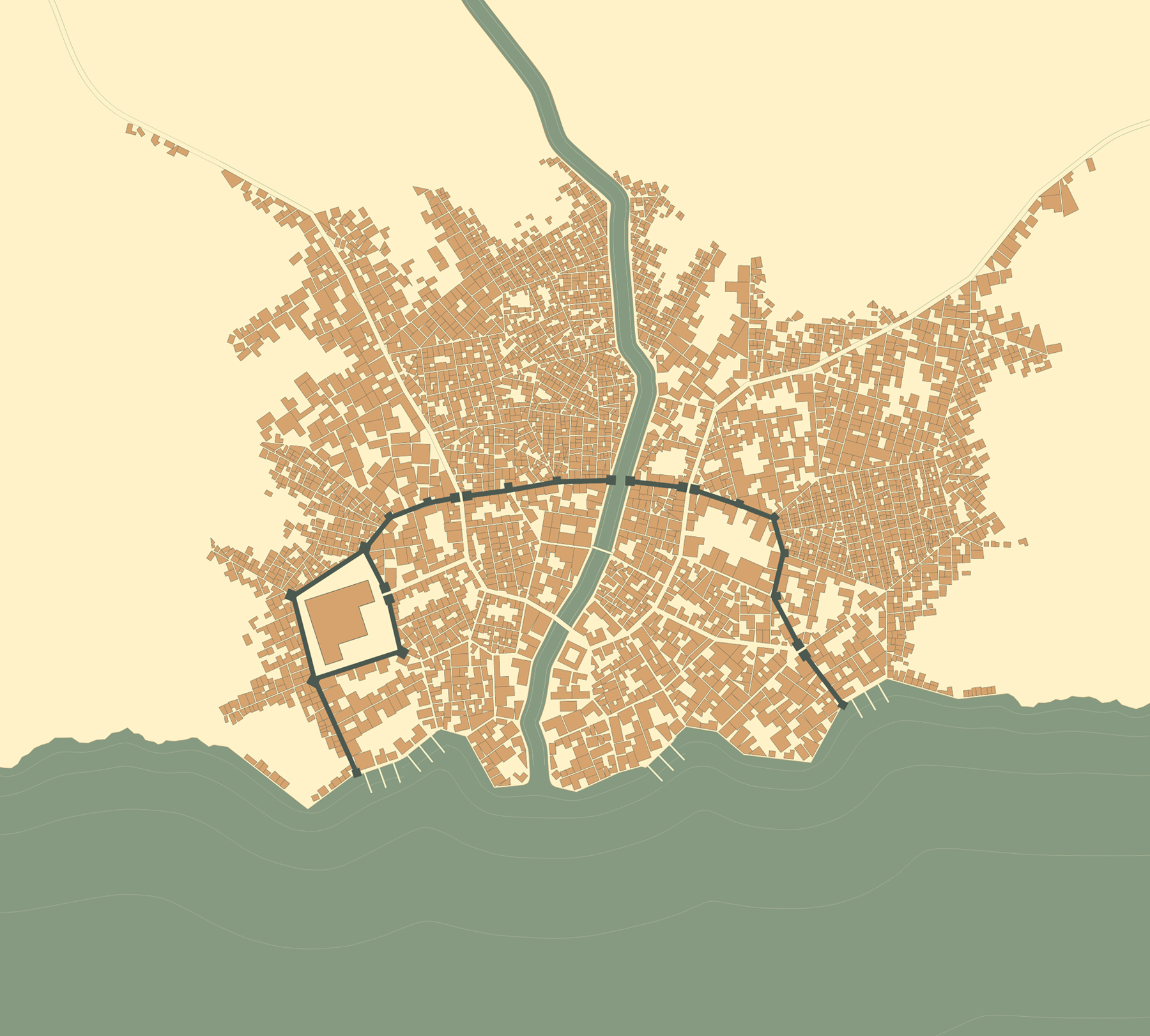 川の両側に建物が立ち並んでいるのが見えた、その先には大きな外壁・・・やがて船は水門をくぐり、外壁の内側にある船着き場へと停泊した。
