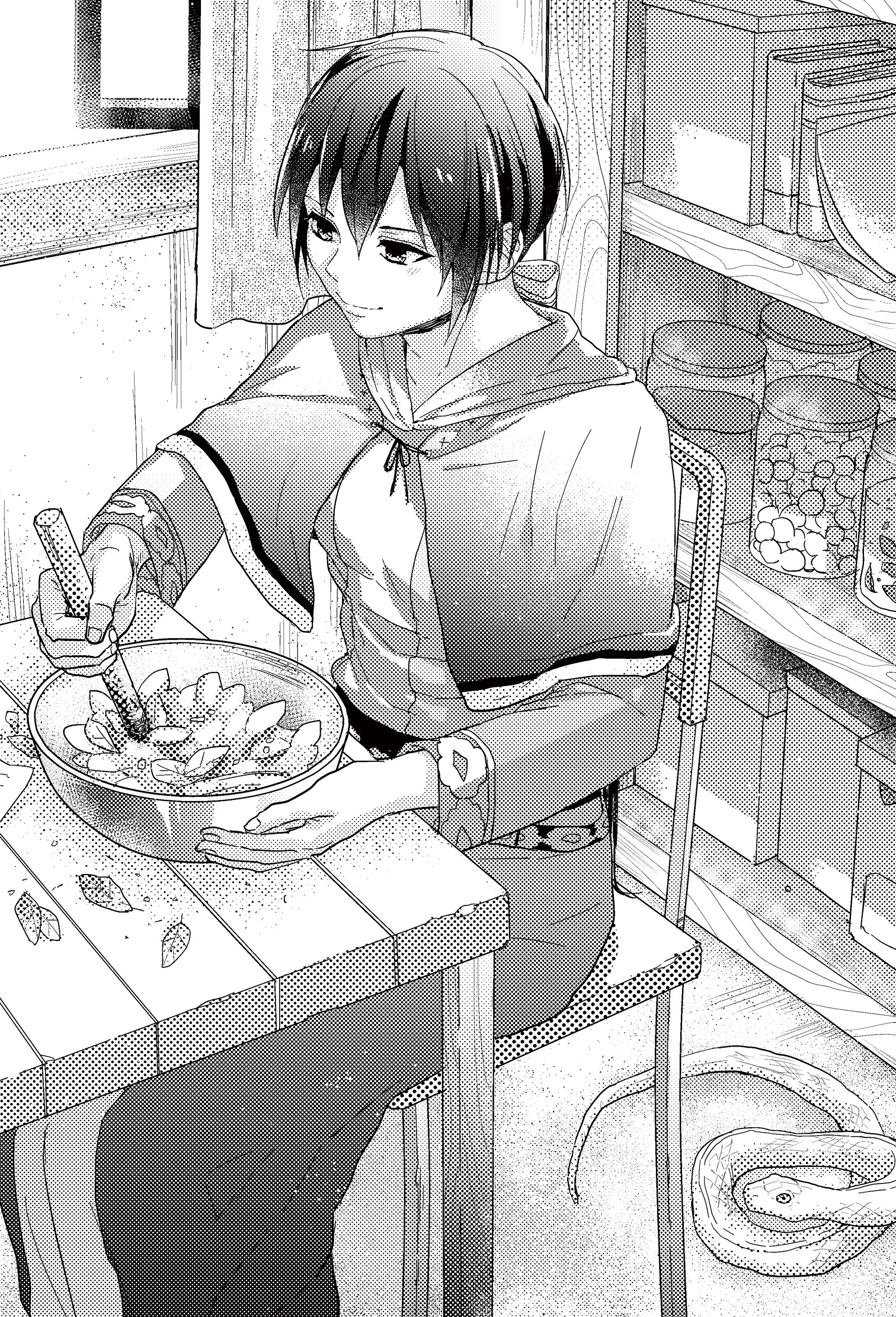 すりこぎを動かす娘の頭の中に、突然そんな声が響いた。視線をすり鉢から離した娘の足元で、白い蛇がちょろちょろと這っている。白蛇の姿を見た娘は、すりこぎを止めた。