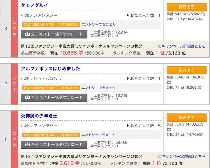 追加更新字数: 現在 19,591 字 /50,000字 ランキング順位: 現在 1,244 位 /3,120 位
