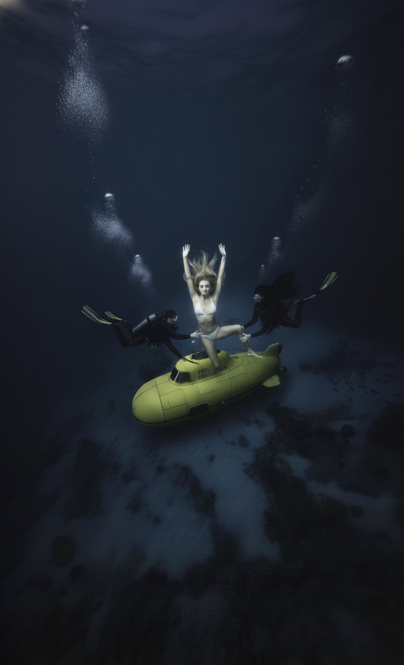 暗黒の深海。潜水艦のハッチから飛び出したサラは、素足のまま、強靭な腸腰筋と背筋を駆使したドルフィンキックで上昇を開始した。