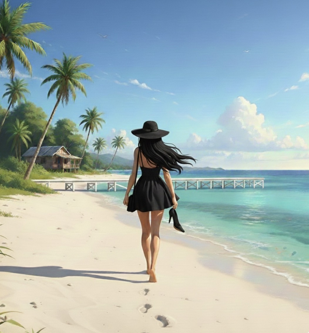 砂浜に降り立つと、彼女は黒のハイヒールを脱いで手に持った。