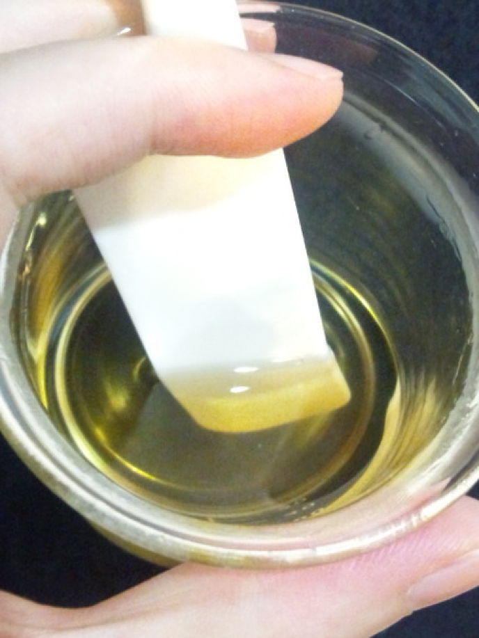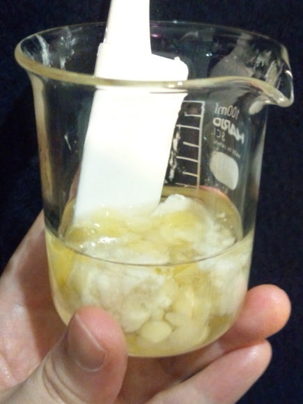 植物オイルをビーカーに入れ、そこに先ほど量ったシアバターと蜜蝋を投入。ここからは、湯煎作業である。