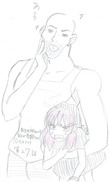 ベッド上の男に断りを入れると、もう片方が死神ちゃんをギラリと睨みつけながら近づいてきた。彼はグレゴリーと同じくらい、つまり、二メートルはありそうな大男だった。青々とした髭の剃り跡にスキンヘッド、そしてボディービルダー並みのムチムチな筋肉が凄まじく威圧感を放っていた。