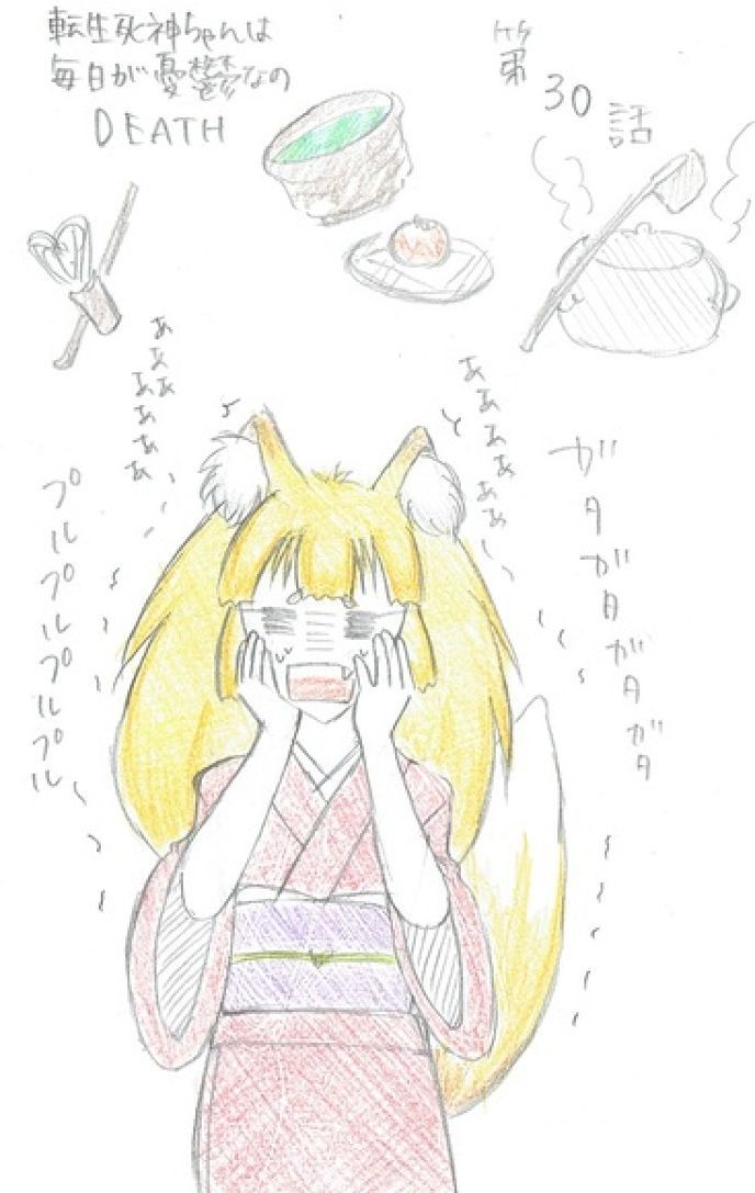 死神ちゃんが天狐に視線を戻すと、彼女は三杯目の椀――死神ちゃんの分を前にして声もなくボロボロと泣き始めていた。完全にパニックを起こし、何から始めたらよいのか分からなくなってしまったようで、悔しそうな顔でじっと椀を見つめていた。――外はすっかりと、雨が降り始めていた。