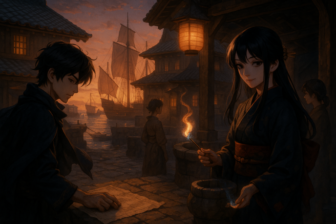 西陽が瓦に反射し、町全体が赤く染まる。魚油の匂いが風に混じり、波止場には異国の船がゆっくりと揺れている。