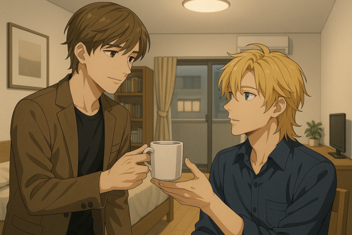 悠斗は大学時代の友人・高瀬碧の部屋に転がり込んでいた。ワンルームの片隅に置かれた、来客用の布団。天井のシーリングライトが、見慣れない光の色で薄く部屋を染めている。