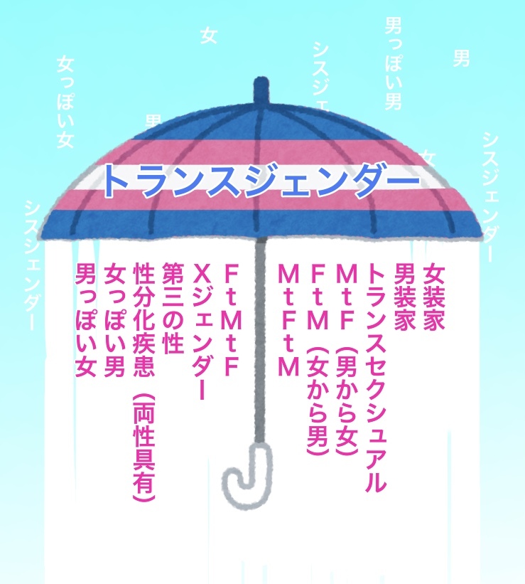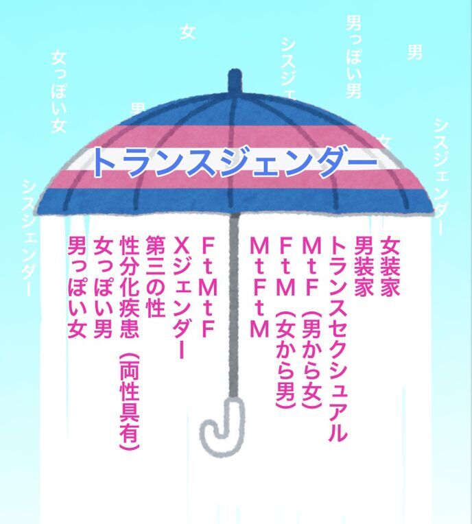 「総称」のことを英語では Umbrella Term という。直訳すれば「傘言葉」だ。なので、越境性差という概念を説明するとき、次の図がよく使われる。