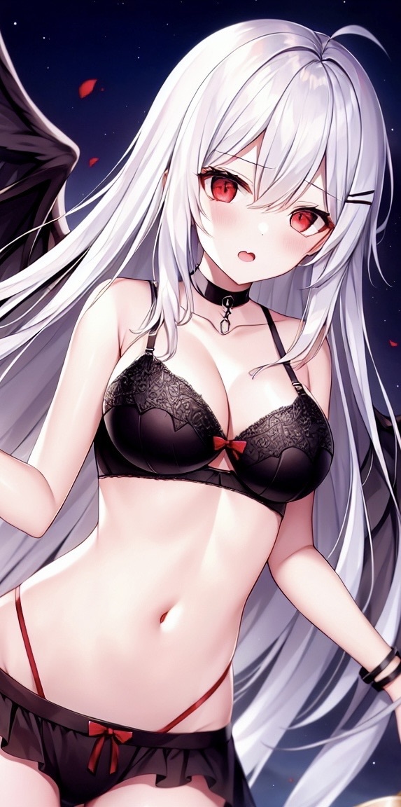 黒いブラジャーと黒いパンツ、チョーカーとブレスレットを着けた姿。