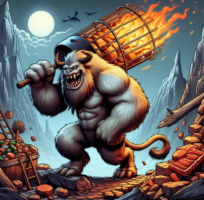 炭火の獣は大きな笑い声を上げた。「いいだろう!試練の内容は、焼肉を焼く力を試すことだ!君たちが、俺が指定する肉を一番美味しく焼けるかどうか、俺の目で確かめさせてもらおう!」