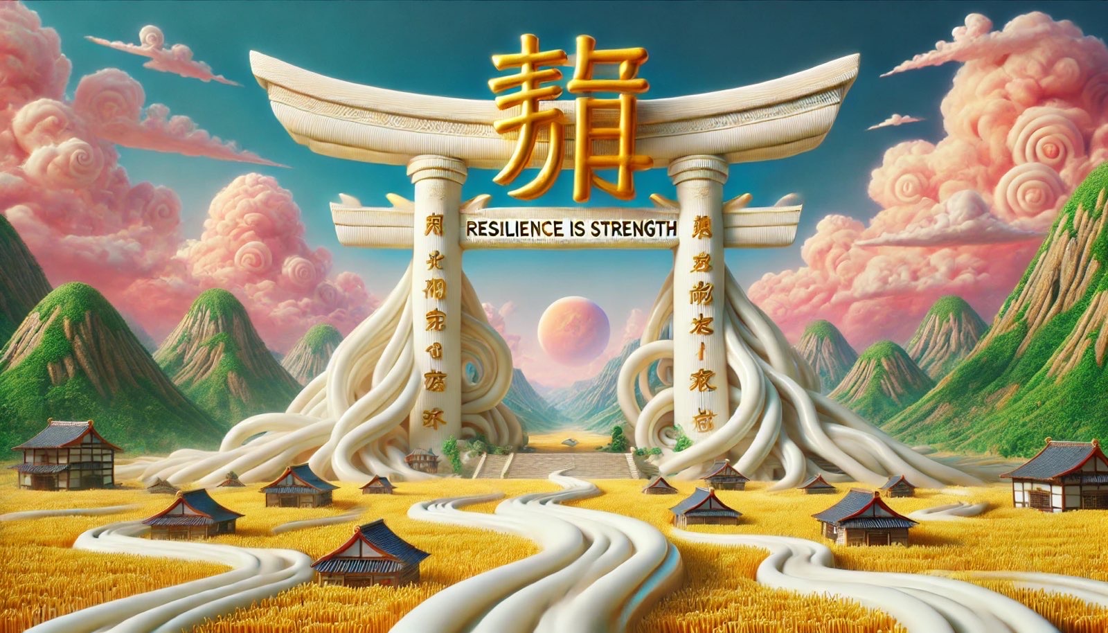 やがてタカシたちは、巨大な白い門がそびえる「うどんの国」に到着した。門の上には金色の文字でこう書かれている。