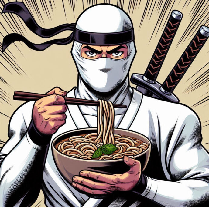 見上げると、白い忍者装束をまとった男が、茹でたてのうどんを片手に、優雅に宙返りして降りてきた。