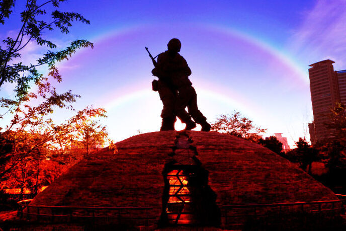 血臭が絶えない戦場で見たあの美しい二重の虹を。