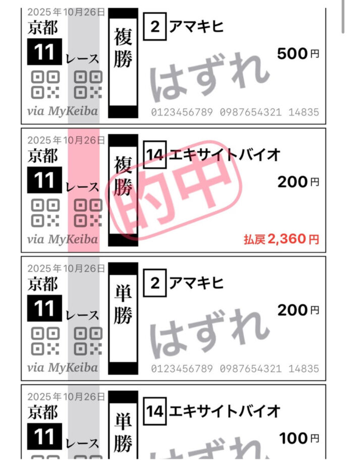 「よし、なんとか抑えた方のエキサイトバイオが来た。3着。よしよし。1,360円プラスと」