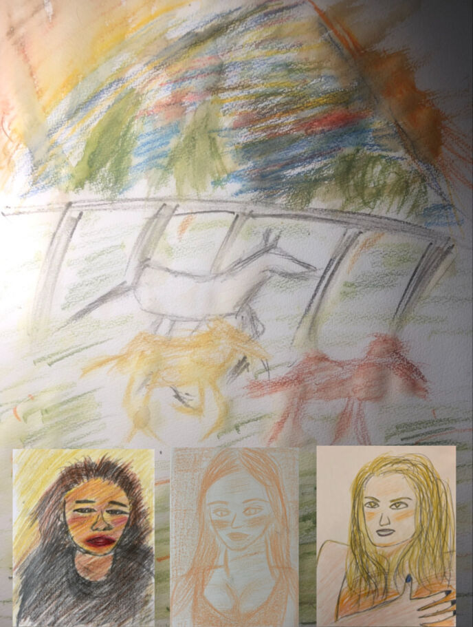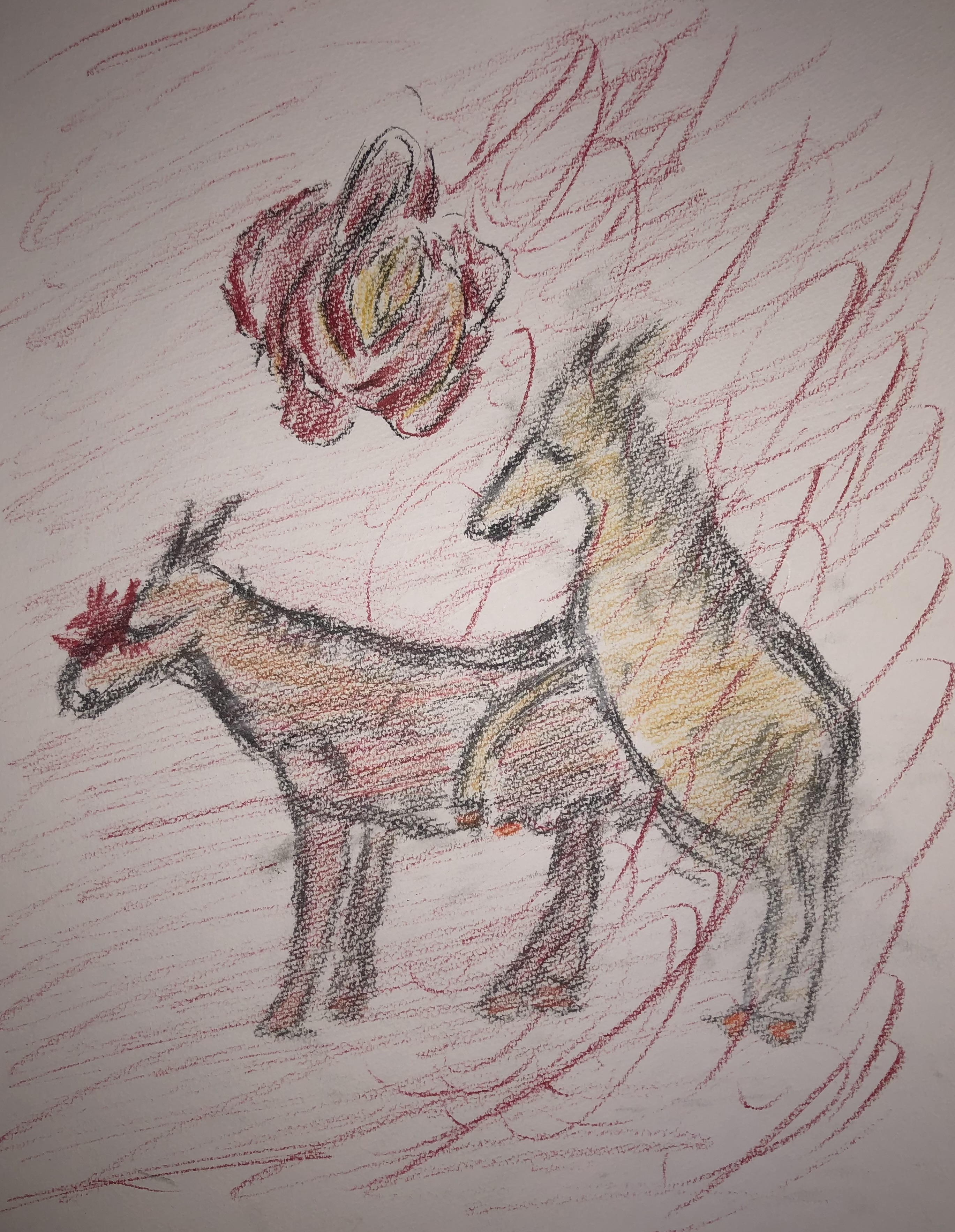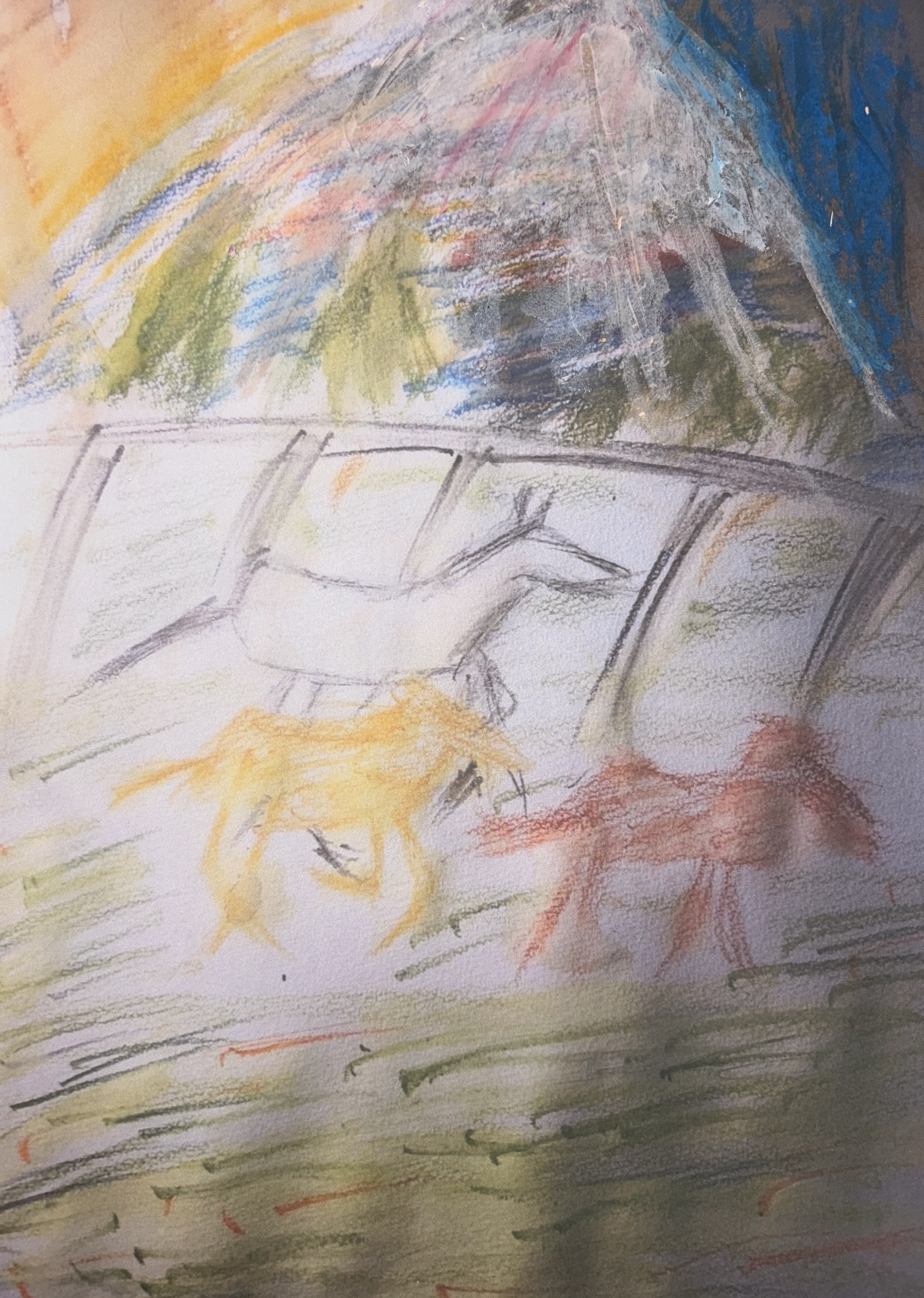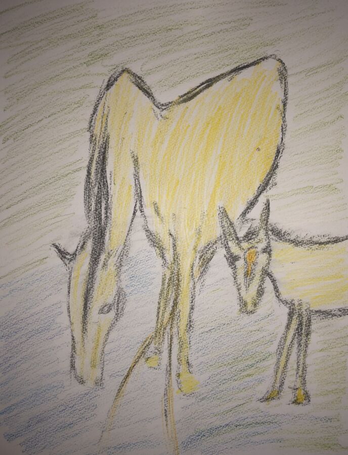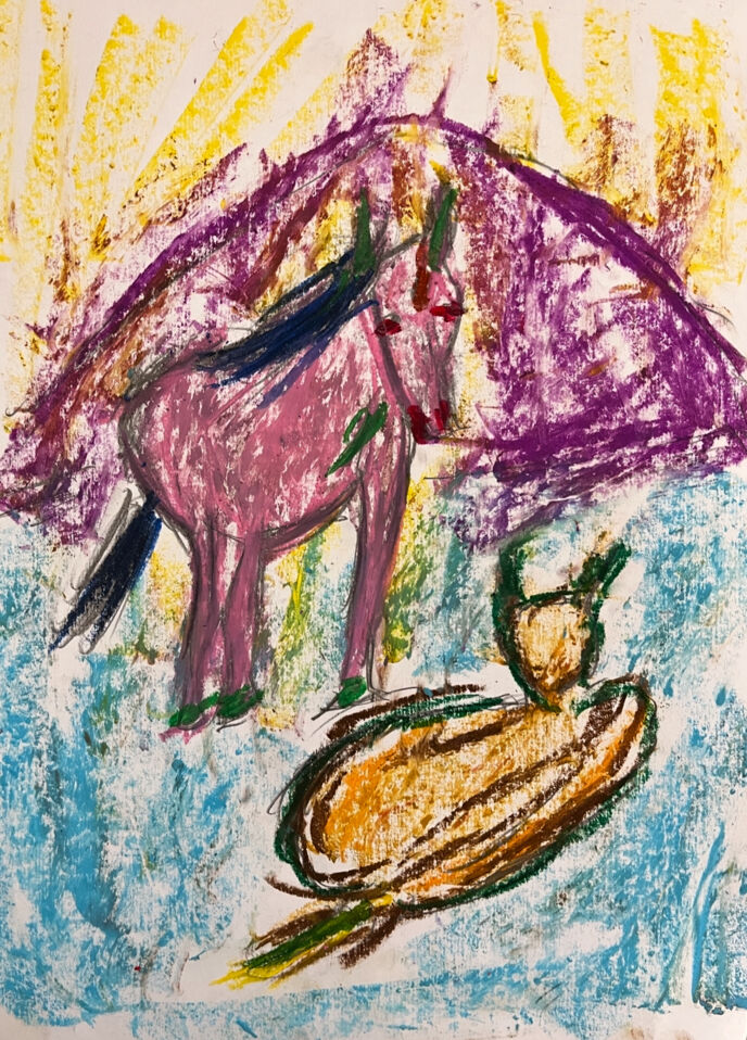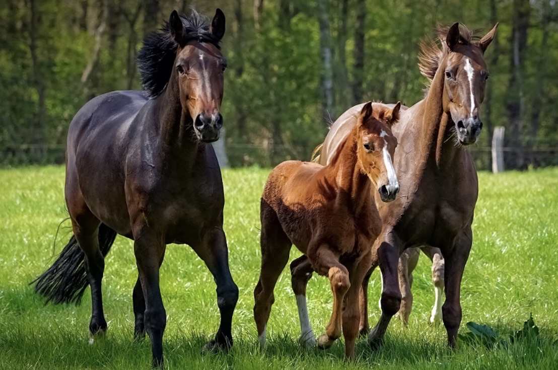 その下にピンクの馬体、1歳牝馬ピンタがいる