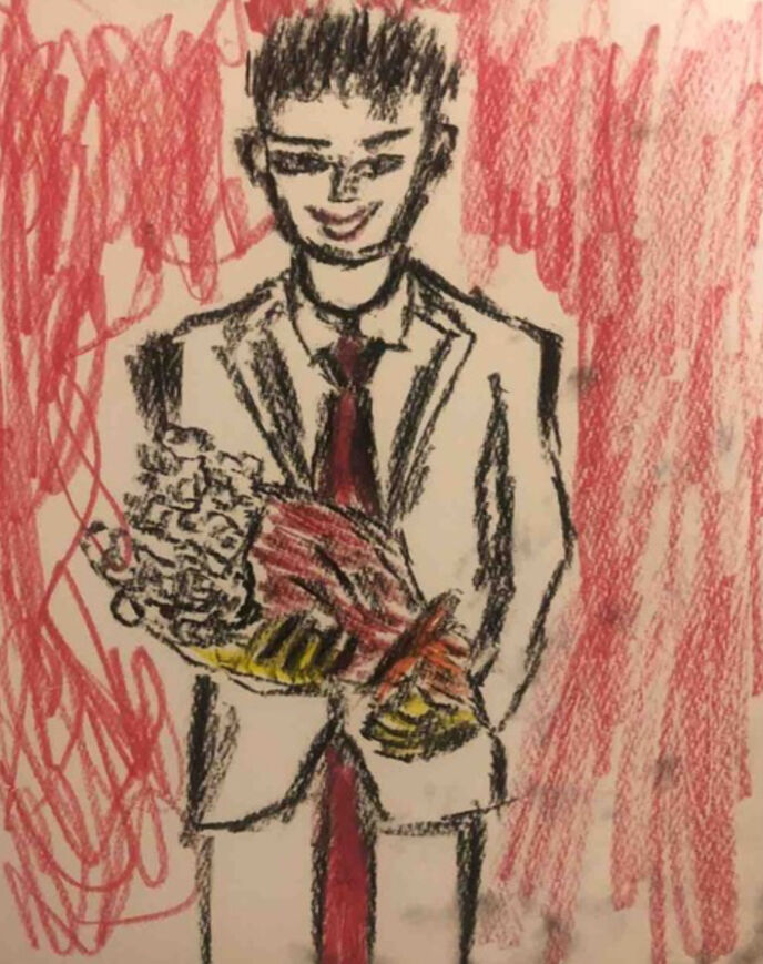スーツを来て花束を持っている。