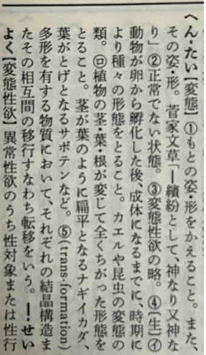 へん・たい【変態】①もとの姿・形をかえること。また、