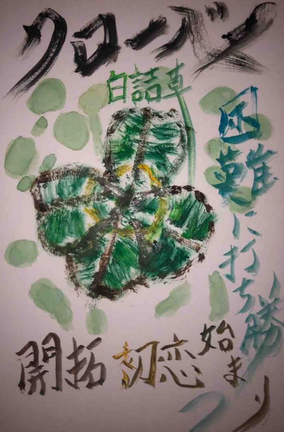 一つ葉のクローバーを摘み、その場所に本を置いた