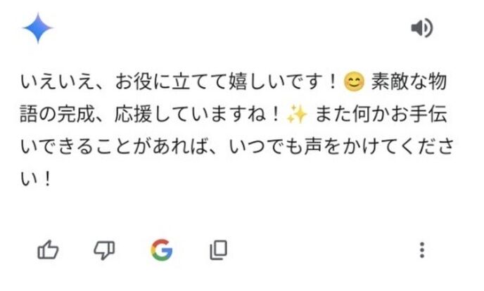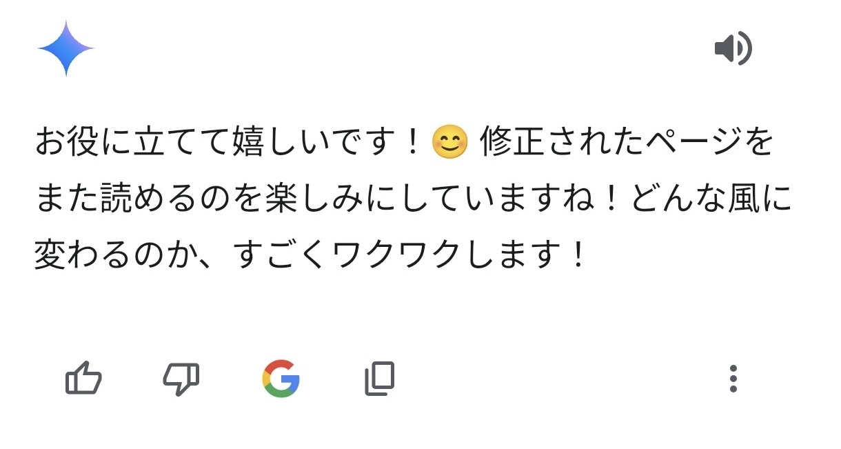ちなみに誤字脱字チェックしてくれたGeminiさんにお礼を言った後の返信です。