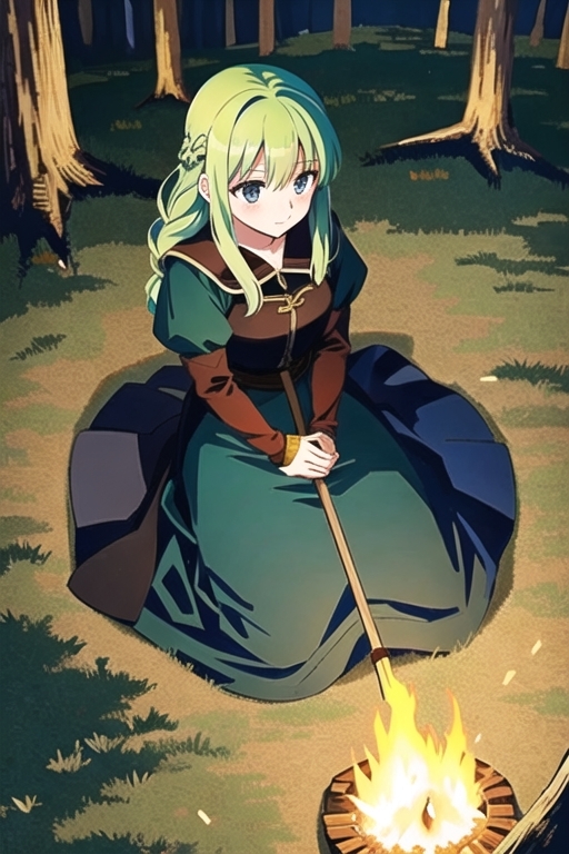 次に中世ファンタジーという指示を入れて微調整したら、なんとか旅芸人にはなりましたが、やはり木の根元で焚き火をしており、更に火に背を向けた絵(しかも焚火の周囲よりも、日の影になっているはずの女の子の顔の方が明るい)が完成。