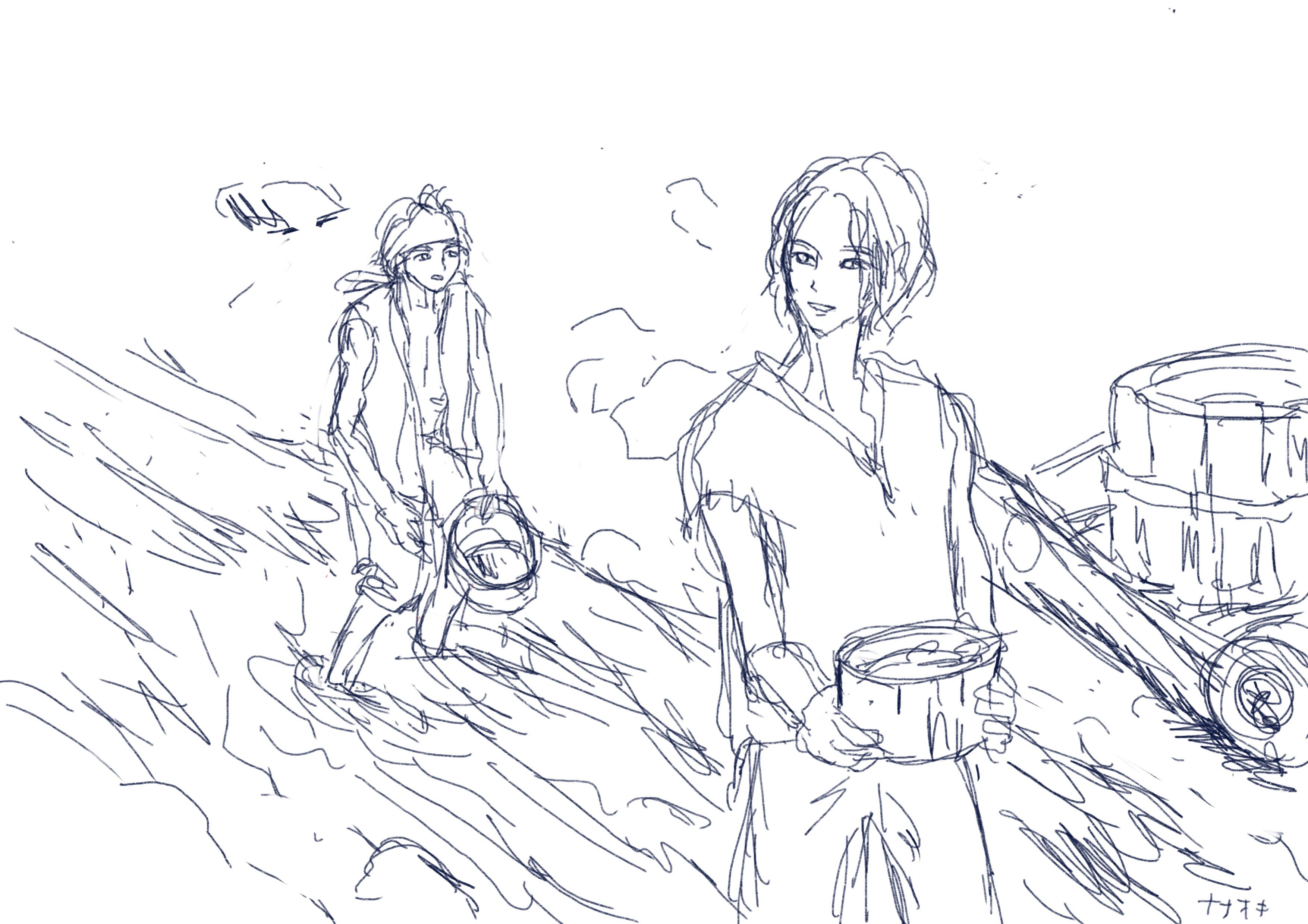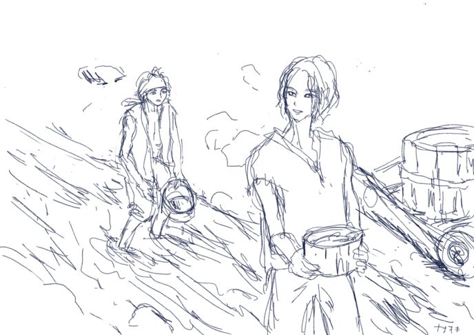 ほぼため息のような乾いた笑い声を吐き出し、2人は力なく立ち上がって、乾いた木の桶と樽を荷車に乗せて川へと向かった。めまいがする気もするが、日差しのせいかもしれない、とにかく体は動く。体を動かせるのなら、どうでもよかった。