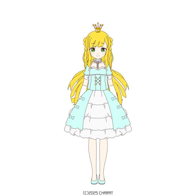 現:鉄の首輪鎖付き、両腕は背中に組み縛られ、チェーン付き輪っかニップルピアス、所々前のドレスの端切れ、裸足。