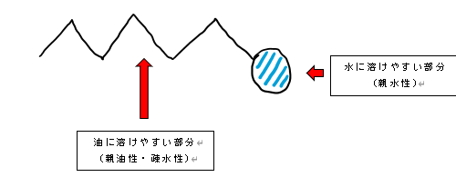 洗剤は、水と混ざりやすい部分(親水性)、油と混ざりやすい部分(親油性・疎水性)を持ち合わせた物質から構成されている。